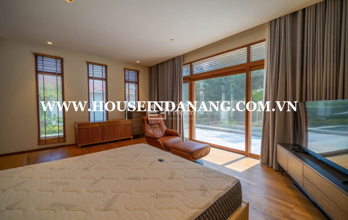 The high- end villa is really spacious and peaceful. It follows Western style architecture of Ocean Estates. Ocean Estates Resort is one of the largest integrated resort developments on Vietnam’s Central Coast and Vina Capital’s award-winning flagship resort. And it awarded 5 star by the Vietnam National Administration of Tourism (VNAT). Ocean villa Estates belongs to Ngu Hanh Son district, Danang city, Vietnam, in the short distance to walk to the beach. Besides, it is in the easy way to drive to Hoi An Ancient Town and Danang city center as well. Moreover, the villa complex is among the international golf courses such as: BRG golf course and Montgomerie link Danang. Danang luxury villas rent consists of the land area of 955 square meters, a big garden, and a large swimming pool. It offers two floors, five bedrooms with en-suite luxurious bathrooms, fully high- end furniture. The rental is US$8,500/month. Already including the management fee.