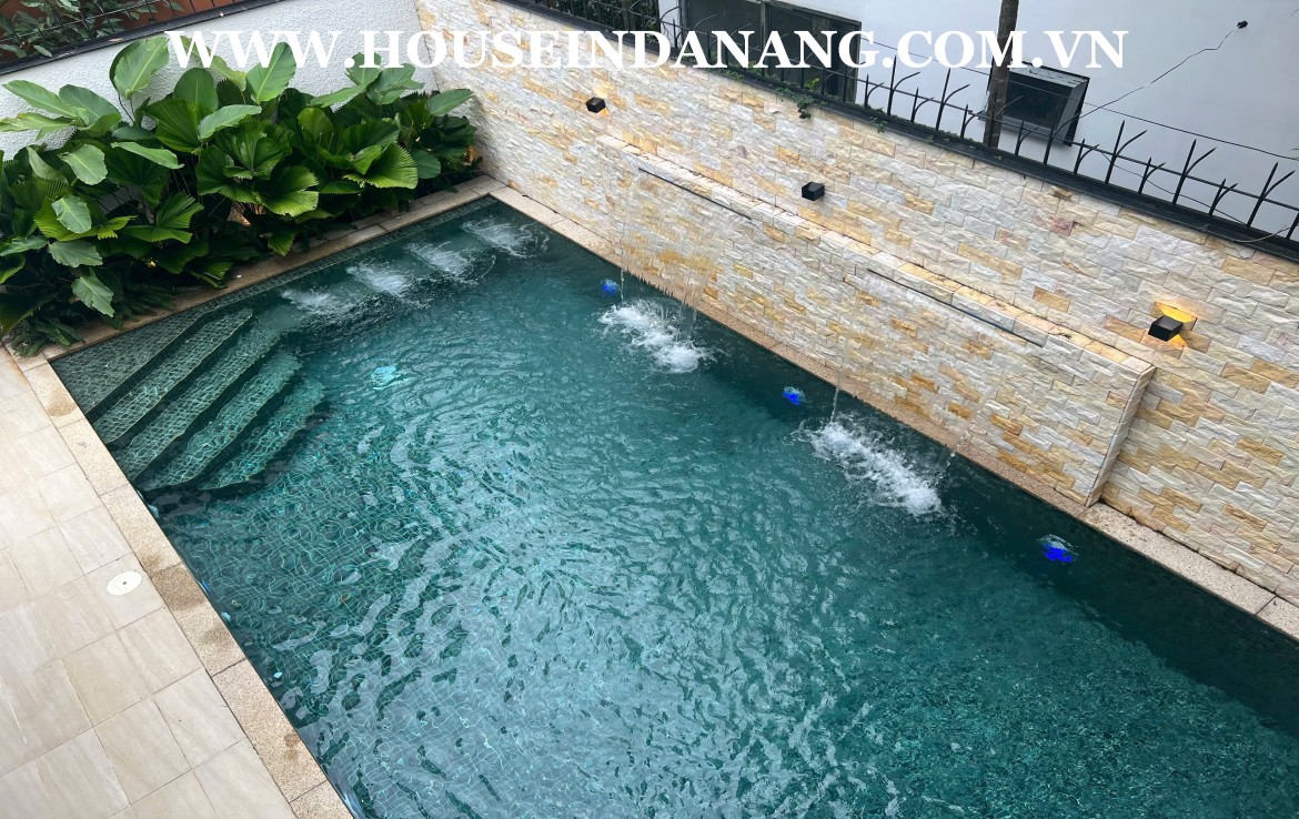 The luxury villa is located in the isolated residential area in Son Tra district, Danang city, Vietnam. It is just in front of Son Tra Peninsula, and in the short distance to walk to the beach bay. The nice villa for rent is quite peaceful with the green surrounding area and all bedrooms can have mountain view. Danang luxury villas rental consists of three floors, the usable area of 360 square meters and a long swimming pool. In addition, there are three bedrooms with the modern ensuite bathrooms, a nice terrace, fully high- end furniture. The rental is US$3,400/month.